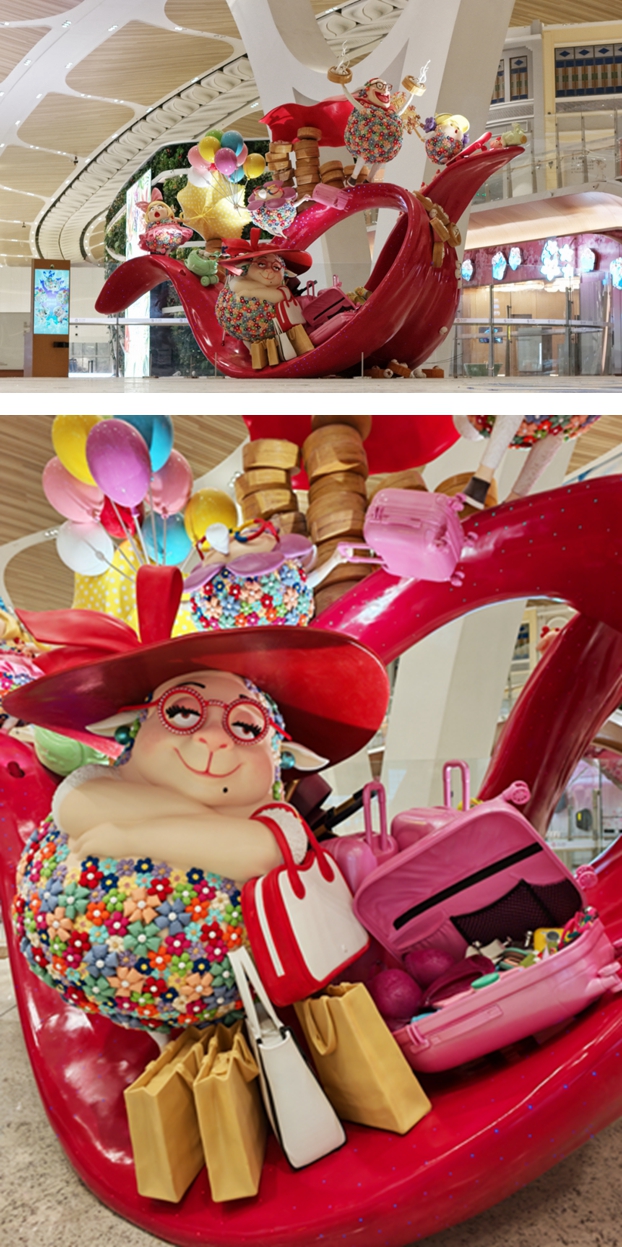 白云机场T3航站楼的公共艺术体系,展现了空间美学理论与实践相结合的探索性实践。通过系统性的规划,艺术介入空间,将航空枢纽转化为承载文化传播功能的复合场域。在创作实践中,项目团队邀请国际顶尖艺术家参与,运用现代艺术语言解构岭南传统文化符号,实现传统艺术元素的创造性转化与创新性发展;同时整合数字交互、虚拟现实等前沿技术,构建动态化、沉浸式的文化感知场景,使传统文化资源获得新的诠释载体与传播路径。