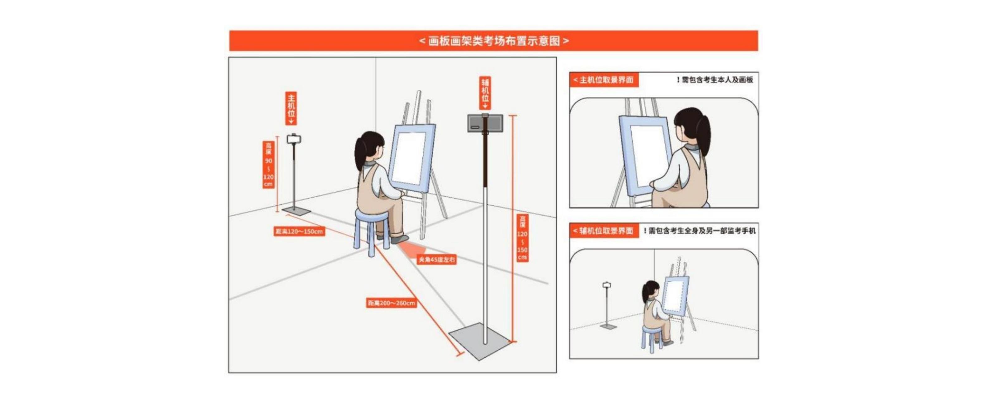 (一)使用画板、画架考场:主机位于考生侧方,辅机位于主机位对侧的侧后方。主机画面涵盖:考生上半身、画板及试卷;辅机画面(全景视角)涵盖:考生全身、脚部地面、画板、画架、试卷及主机。
