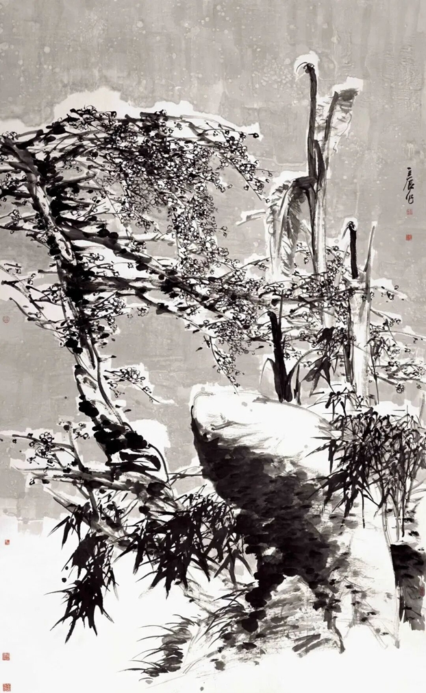 张立辰《梅雪共春》宣纸彩墨,355×218cm,2006年